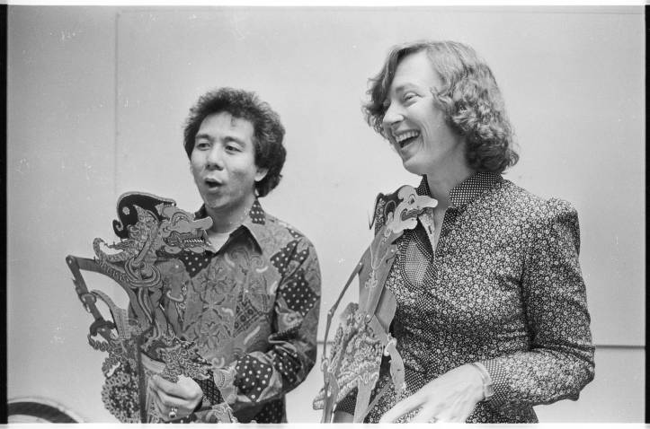 Mary Anne Flournoy and Eddy Nugroho Sandjaja with Indonesian puppets, Ohio University, 1982
